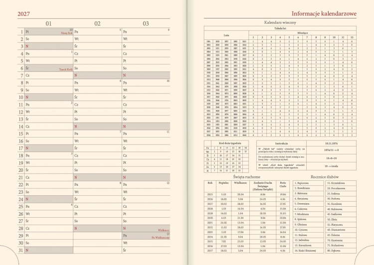 skrócone kalendarium roku bieżącego, poprzedniego i następnego,