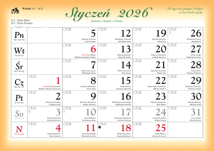 kalendarium: 1 miesiąc na stronie, imiona, dni świąteczne