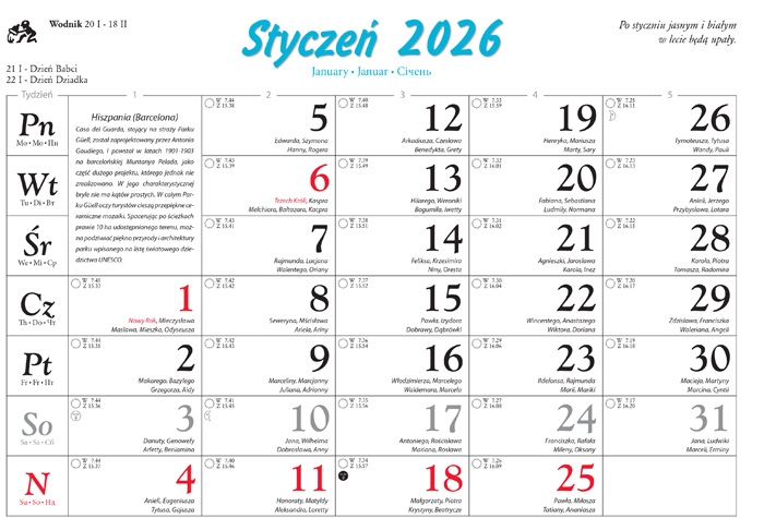 kalendarium: 1 miesiąc na stronie, imiona, dni świąteczne